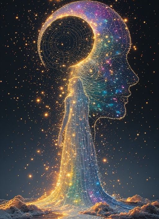 A woman in an ornate dress surrounded by celestial bodies and cosmic elements.