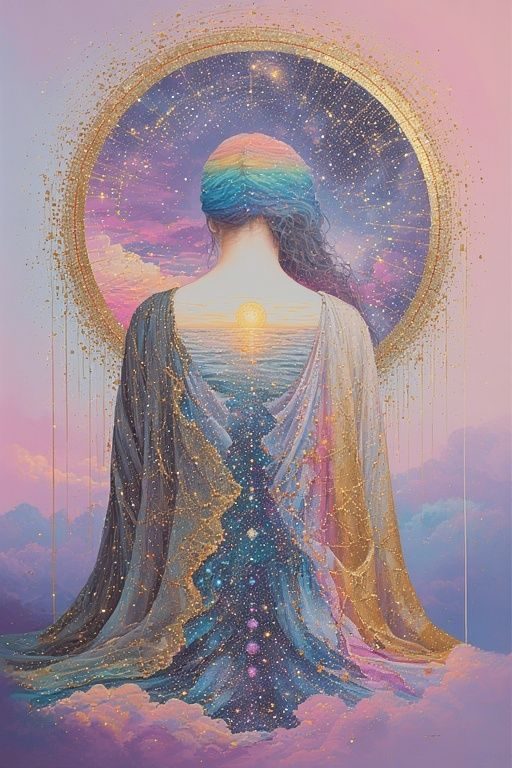A woman in an ornate dress surrounded by celestial bodies and cosmic elements.